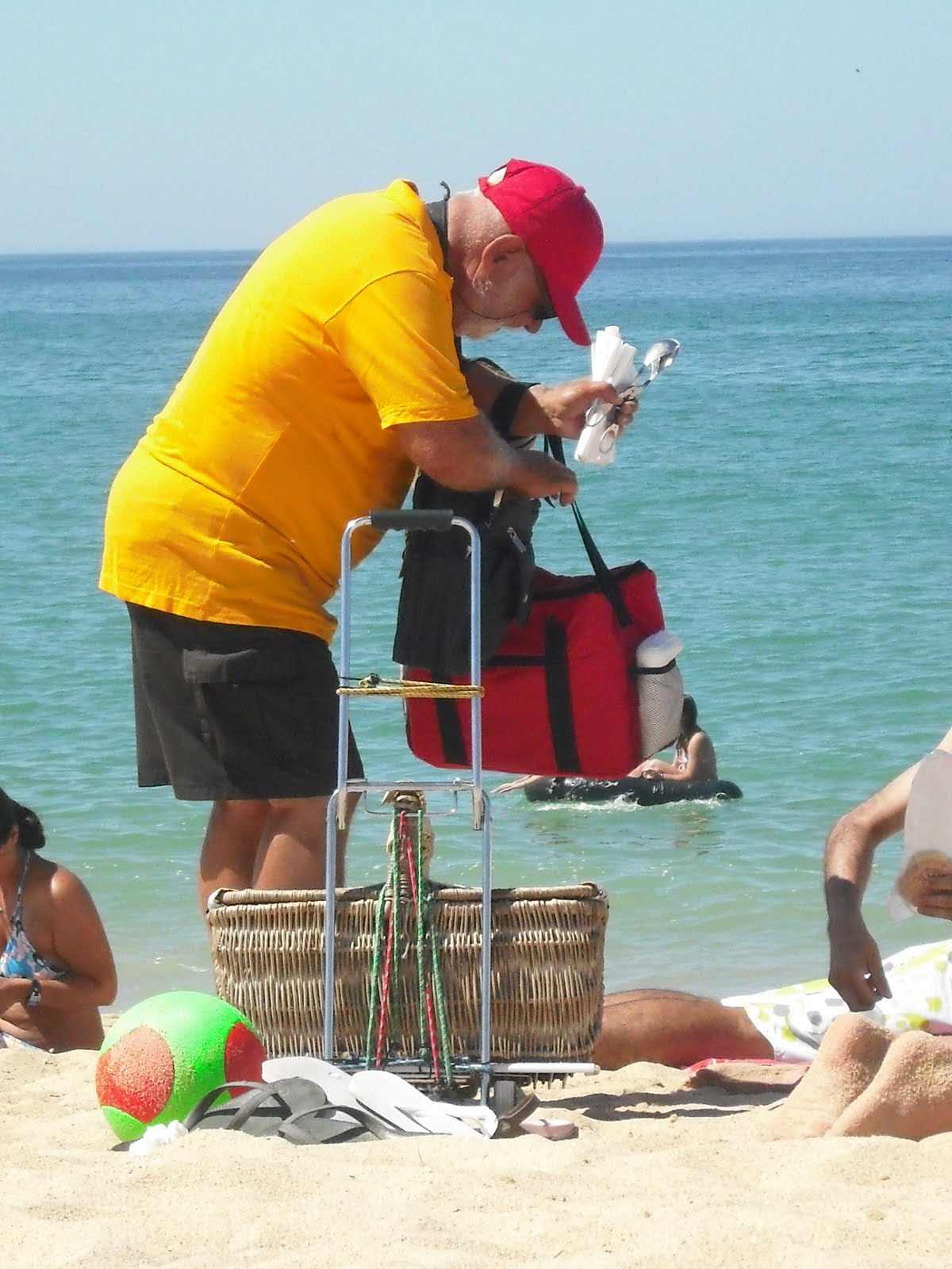 Se há figura obrigatória que desfila nas nossas praias, essa é o vendedor de Bolas de Berlim. Na praia de Faro deve haver uma meia dúzia, mas este é aquele que nos encanta com as suas rimas. Além do seu ar diferente - normalmente os vendedores vestem-se de branco, certo? - os pregões que usa para chegar junto dos veraneantes são, realmente, qualquer coisa: